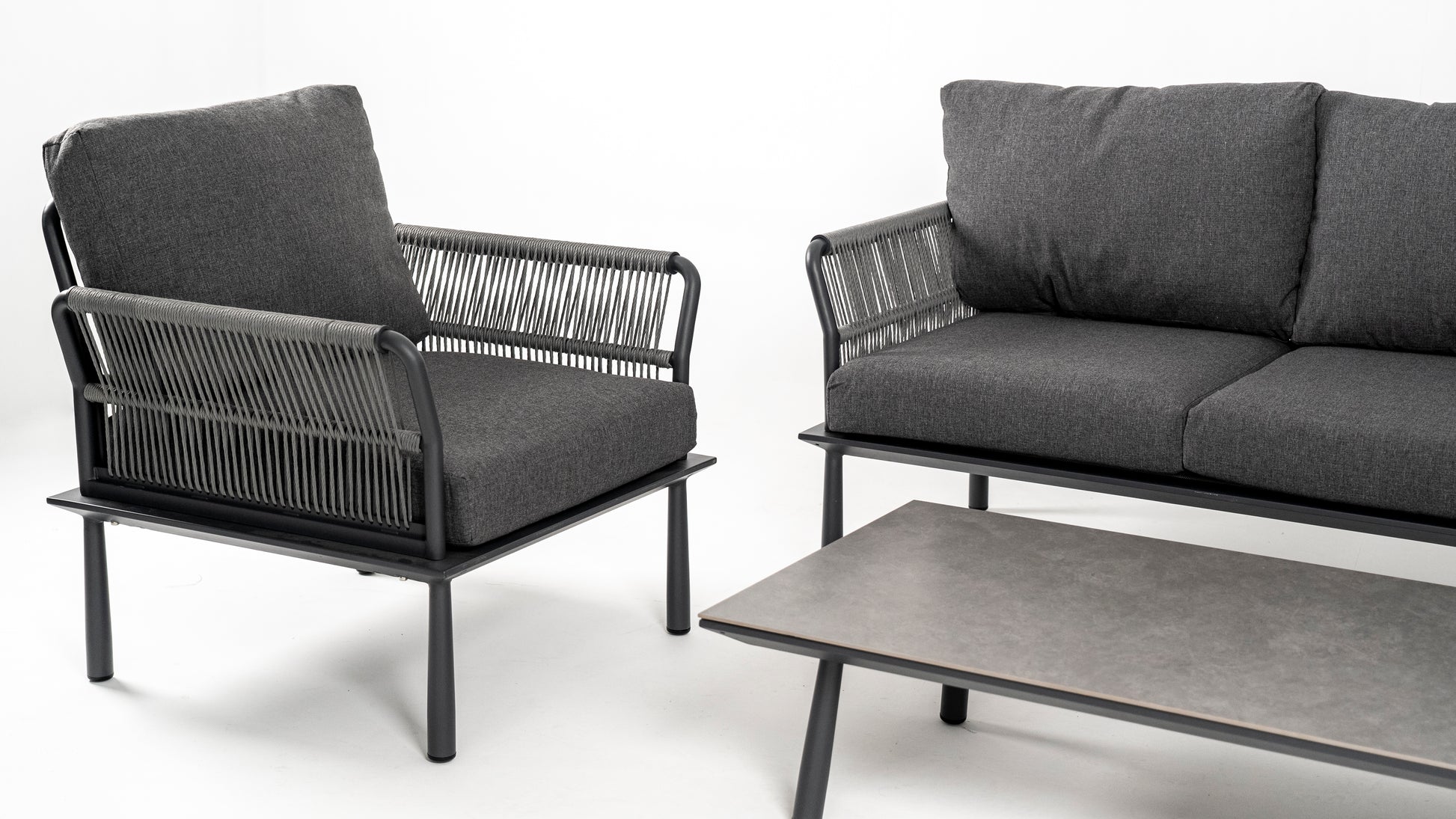 De onderhoudsvriendelijke loungeset Trino kenmerkt zich niet alleen door het aluminium frame en tafel, maar biedt ook een comfortabele zitervaring dankzij de 12 cm hoge lichtgrijze kussens. Het is een 4-delige set. De tafel beschikt over een sintered stone blad. Een ware allemansvriend, zo kan loungeset Trino het best omschreven worden.